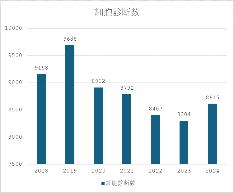 例えば婦人科では医師は子宮の入り口を綿棒でこすって細胞をガラスに塗り、病理診断科に提出することがあります。病理診断科の細胞検査士と病理医はそれを顕微鏡で見て異常な細胞(「異型細胞」と言います)か、良性細胞かを判断します。