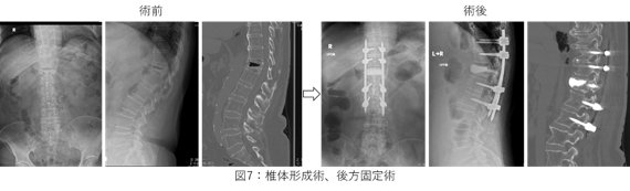 手術の際には骨セメントを用いた椎体形成術、スクリューを用いた固定術、脊髄の圧迫を解除する除圧術、これらを組み合わせて行います(下図7)。近年この椎体形成術および固定術は小さな皮切で経皮的に行うことが可能ですので、可能な範囲で少しでも低侵襲な手術を目指しております。