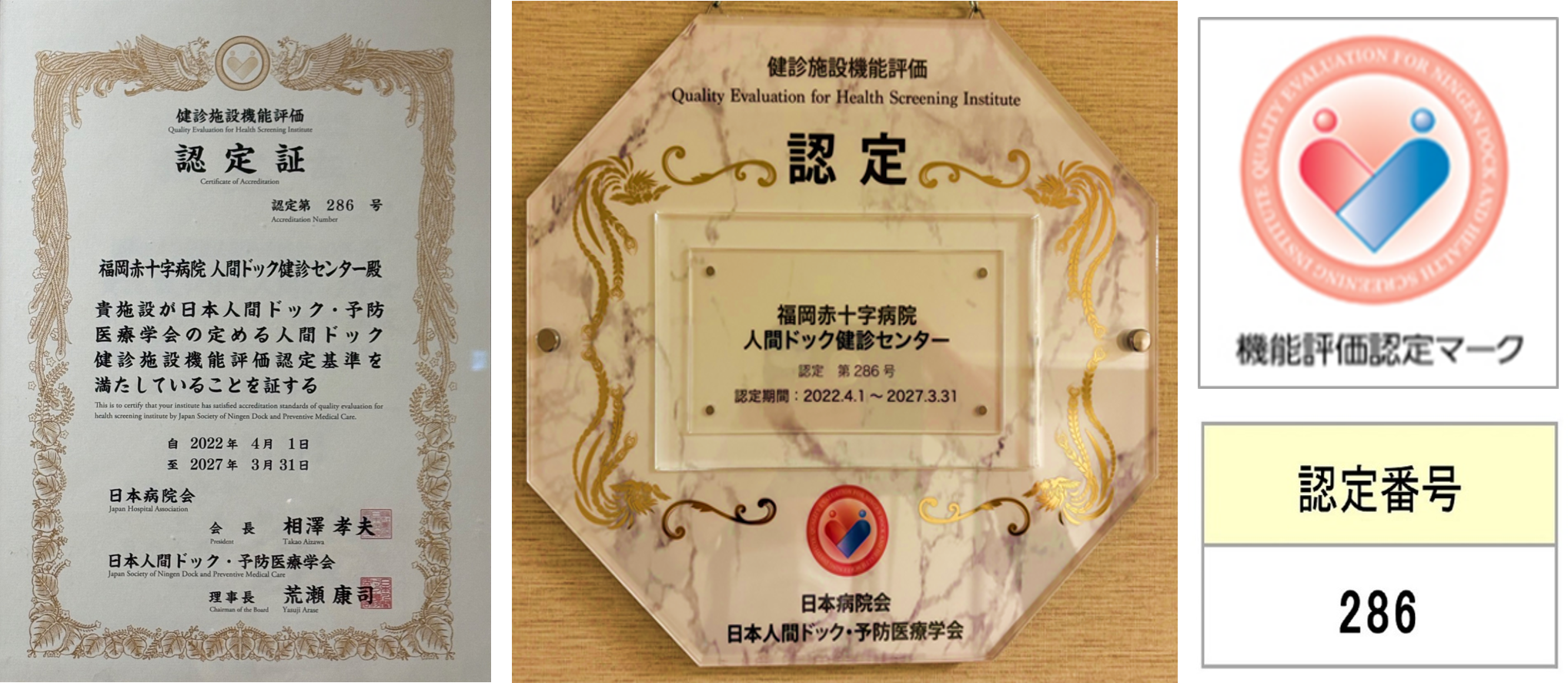 福岡赤十字病院 人間ドック健診センターでは、受診者の方が安心して質の高い人間ドック・健診を受けられるように、第三者評価として「日本人間ドック・予防医療学会」の健診施設機能評価を受審し、認定施設に認定されています。