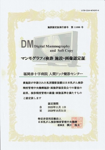 福岡赤十字病院人間ドック 健診センターでは、装置更新に伴い、日本乳がん検診精度管理中央機構の審査に合格し、「マンモグラフィ検診・画像認定施設」として認定を受けました。