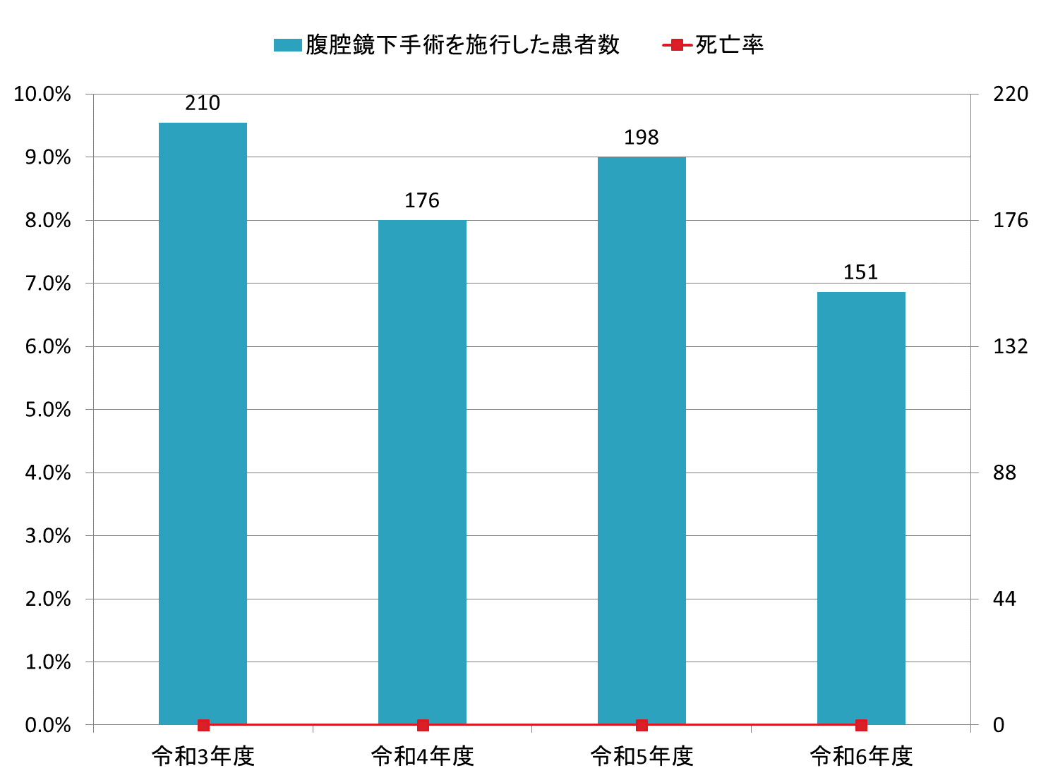 腹腔鏡手術の中には、併存疾患を多く持つ患者さんでの消化管狭窄、閉塞のため在院死のリスクが高い場合でもやむを得ず行う場合も含まれています。当院の腹腔鏡手術後の死亡率は、平成26~令和元年度までは0%でしたが、令和2年度には多発遠隔転移を伴う高度進行直腸癌に対し、出血疼痛コントロール目的で手術後に死亡した症例を経験しました。以後は死亡症例がありません。