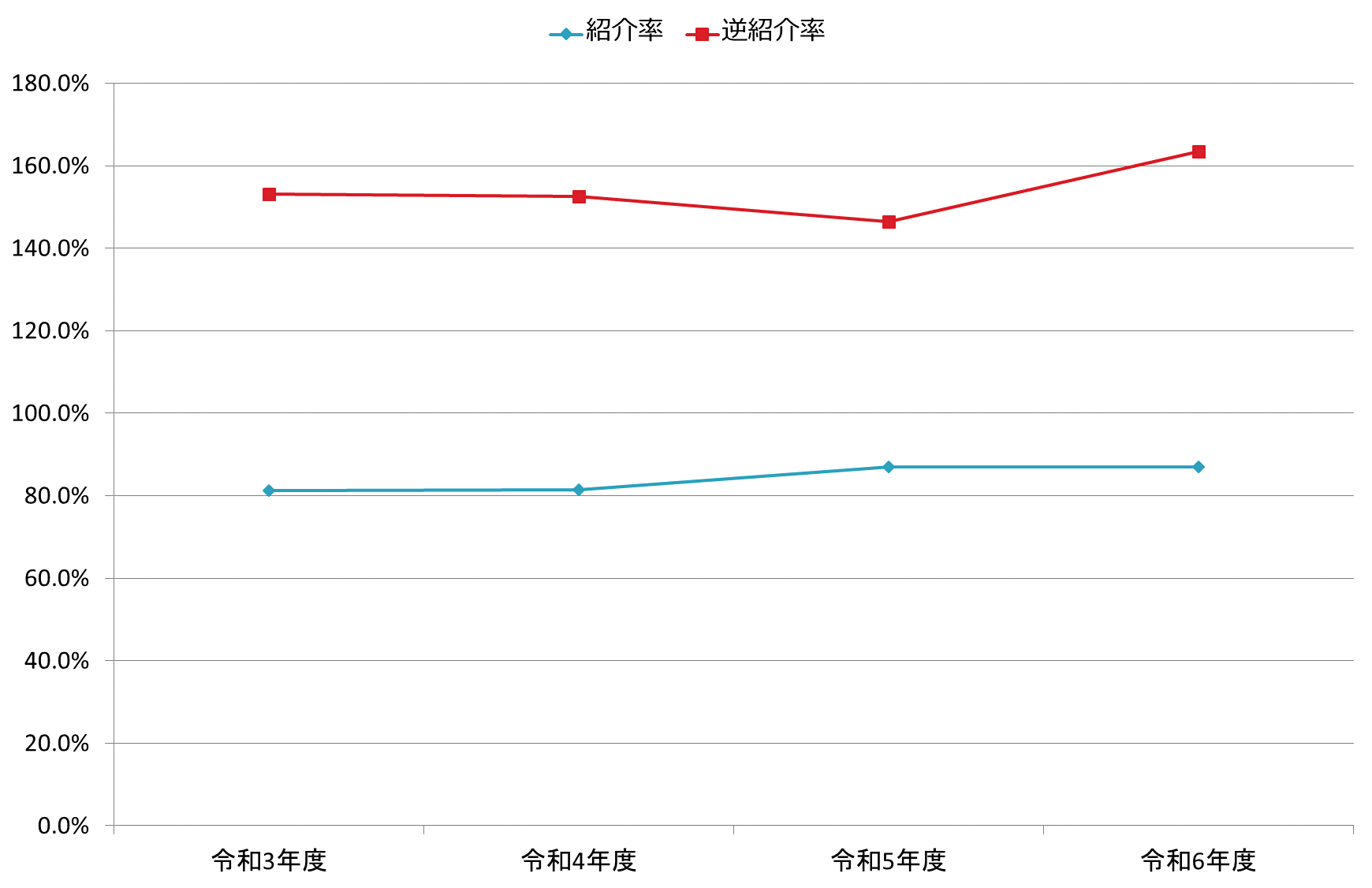 紹介率とは、初診患者さんのうち、他の医療機関から紹介されて受診する方の割合であり、逆紹介率とは、当院から他の医療機関に紹介した患者さんの割合を示しています。地域の病院・診療所との連携の密度の指標になります。